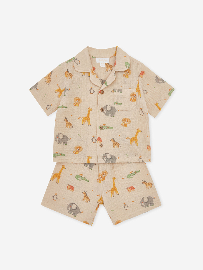 Мягкий комплект из муслина — рубашка на пуговицах и лёгкие шорты с комфортной посадкой. Воздухопроницаемая ткань приятна к телу и не перегревает малыша. Принт с животными добавляет игривости, а крой сохраняет свободу движений. Отлично подходит для прогулок и повседневной носки летом.