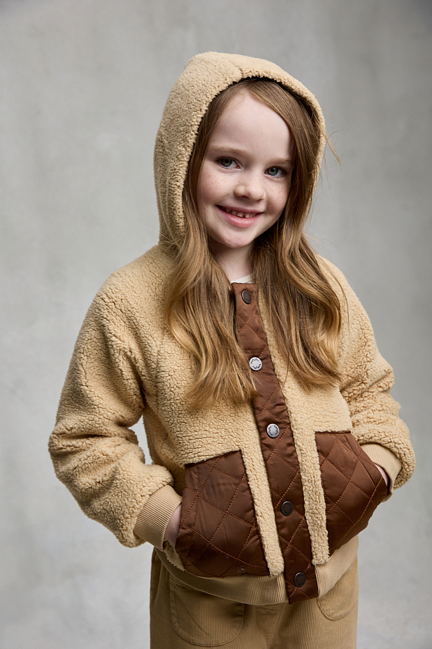 Мягкий плюшевый эко- ширлинг удерживает тепло, остаётся лёгким и приятным на ощупь, а подкладка из 100 % хлопка «дышит» и не раздражает кожу. Объёмный капюшон защищает голову от ветра, эластичные манжеты и нижняя резинка фиксируют посадку и не пропускают холод. Фронтальная планка на надёжных кнопках ускоряет переодевание, стёганые накладные карманы усилены дополнительным слоем ткани для долговечности. Свободный крой с опущенной линией плеч не ограничивает движений и легко надевается поверх свитшота или худи. Куртка рассчитана на демисезон — подходит для прогулок, поездок и детского сада, сохраняя форму и объём даже после частых стирок.
