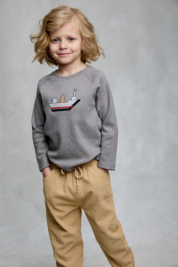 Уютная детская толстовка для мальчиков в спокойном сером цвете дополнена изящной вышивкой корабля или нефтяной вышки на груди, что делает её идеальным выбором для юных мореплавателей и любителей индустриального дизайна.